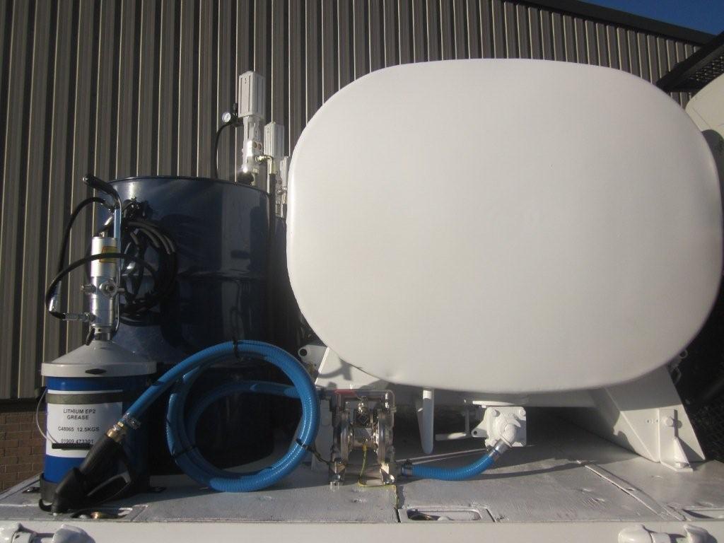 3x 205 litre drums for engine oil, hydraulic oil and gear oil fitted with air operated pumps and retractable hose reels.