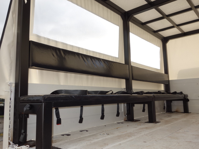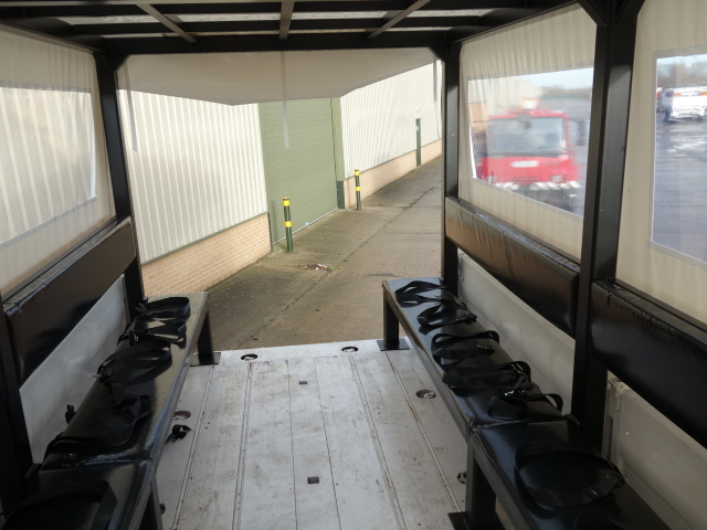 Fitted with a new manufactured heavy duty steel frame with new bench seating and seat belts to carry up to 20 persons, new tarpaulin with side windows, rear step ladder access.